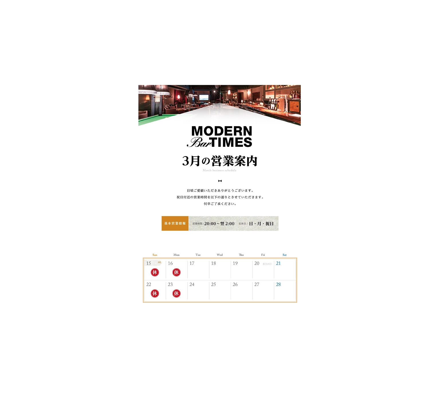 いつもサイトをご覧いただきありがとうございます。2月の営業カレンダーをご用意いたしました。当店の営業についてご案内です。 定休日が日曜・月曜・祝日のため、 にお休みをいただき、日曜・月曜は定休、他の日にちは通常営業させて […] -